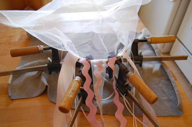 La mejor manera de conseguir un asimiento firme es poner el pegamento en el interior del aro exterior, ponga el aro interior sobre el tul y las cintas, luego fijar todo en su lugar.