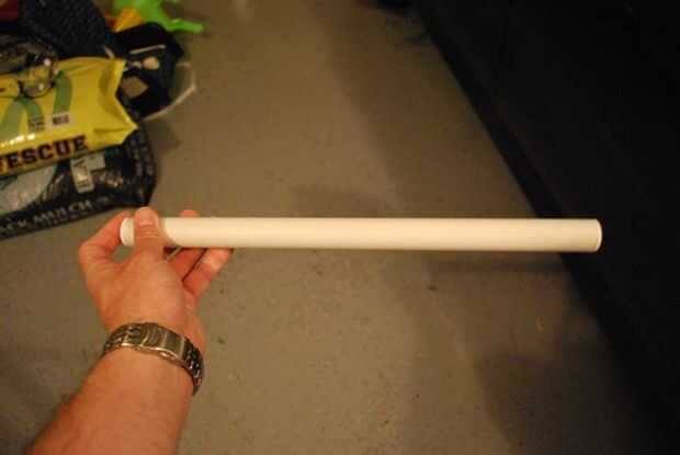 Tomé uno de los segmentos de PVC de 9.5" y consolidó una tapilla interna que consiguió de Formufit sobre él, entonces llenas el resto con arena que robó de mi caja de arena de 2 años de edad. Me lleno muy bueno, dejando de ¾" de una pulgada en la parte superior para dejar espacio para el segundo tapón cementado a. Lo que usted termina con es un tubo lleno de arena con tapas en ambos extremos.