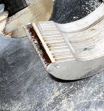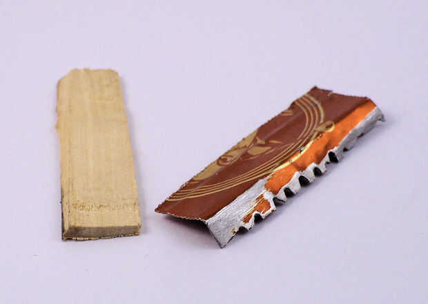 A continuación hacer una cuña pequeña (sólo forma un pedazo de madera con papel de lija), poner la hoja de metal de la lata de soda en la ranura y mantener que forma la cuña hasta que las cuñas las la soda puede de cuchilla firmemente en su lugar. Una vez que un ajuste apretado sólo doblar el metal con la mano un poco hacia adelante y recorte el exceso. Agregue su rodillo de la cinta y hacer unos cortes de prueba. Presentar algunos dientes de la cuchilla como se puede ver en la imagen pero encontré que era que un paso innecesario ya que no toma mucho para cortar la cinta y metal esta fina es un poco dentados y afilados después de cortar con las tijeras antiguas.