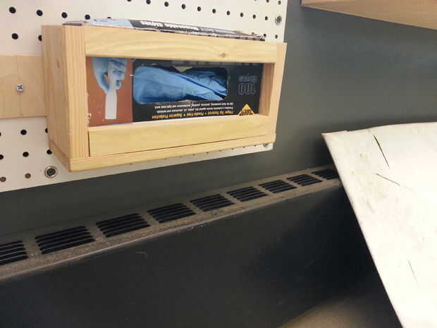 Estaba cansada de perder siempre mi caja de guantes de látex. Tiré la caja alrededor de mi mesa de trabajo y garaje cada vez que cogí un par. La caja sí mismo sería conseguir machacada en herramientas, así que me decidí a montar en el pegboard y en el mismo lugar cada vez. También quería hacerlo así que fácilmente podía recargar con una nueva caja.
