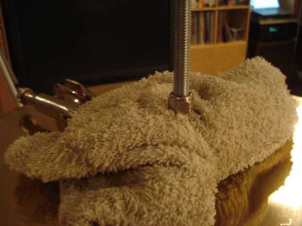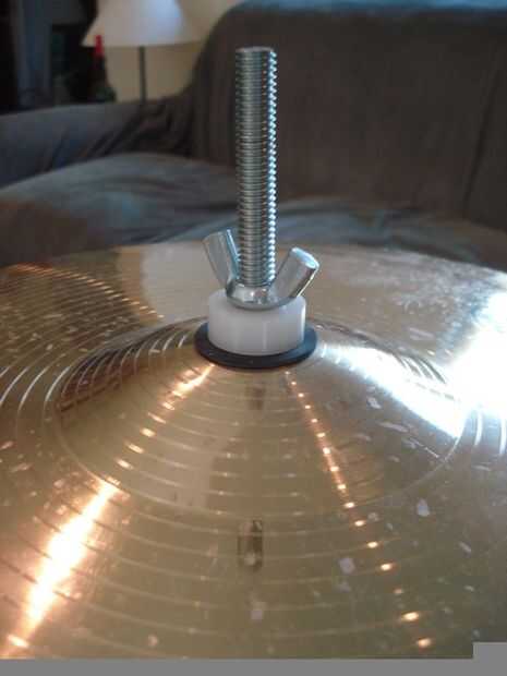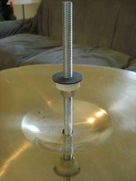 Luego enroscar la segunda tuerca de nylon donde usted desee el platillo superior para sentarse. Me pareció la manera más fácil de hacer esto sujetar la varilla con puños y un trapo mientras que rosca la tuerca. Por desgracia, ya que es una tuerca de bloqueo, el hi-hat no será fácil de ajustar, pero esperemos que usted no tendrá que ajustar a menudo.