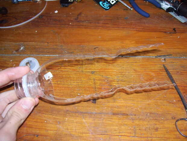 ¿Ver esos agujeros en la parte superior del casco? se inserte las tiras de plástico de la botella allí y coloque la tapa con el tornillo del trípode cosita
