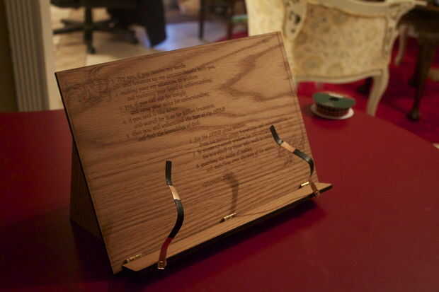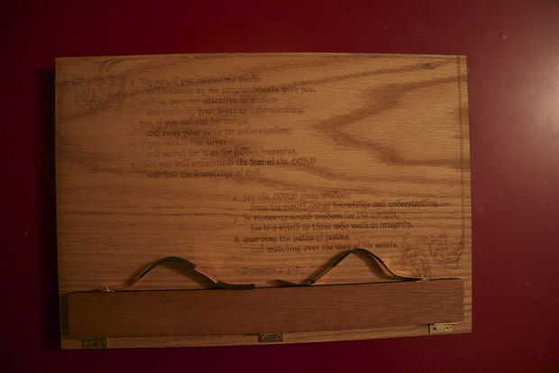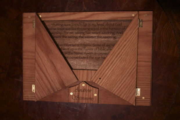 Esta versión en particular es mi primer intento de hacer uno yo mismo. Fue un regalo a mi cuñado. Puesto que él es un estudiante de seminario, y desde que tuve acceso a un láser CNC, había grabado un pasaje de la Biblia en el frente y una cita de uno de sus teólogos favoritos en la parte posterior. Tuyo puede personalizarse quieras--con una pintura, una nota personal, un poema favorito o cita, la primera línea de Beowulf o cualquier otra cosa que se puede pensar. Si no tienes un láser CNC, seguramente que algún negocio local ofrece grabado personalizado.
