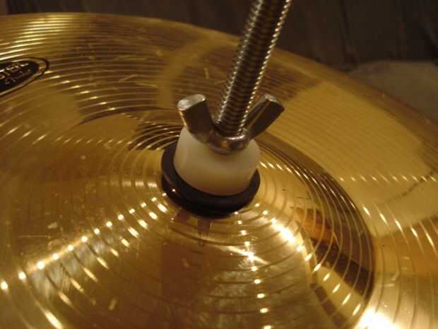 Enroscar la tuerca de mariposa para mantener todo seguro. Encontre que apretando la tuerca de mariposa todo lo ajustado dio el platillo más de un sonido de platillo ride, mientras que dejando aproximadamente 1/8" a 1/4" de sala meneo dejó sonar como un platillo crash, que es lo que he optado por.