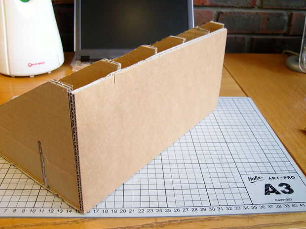 Pegar primero la barra de soporte para la base. Luego pegar las secciones de soporte a la base de apoyo, añadir la parte de atrás y delantera.