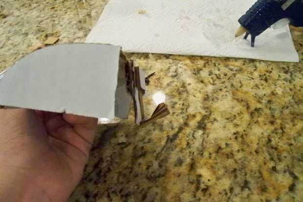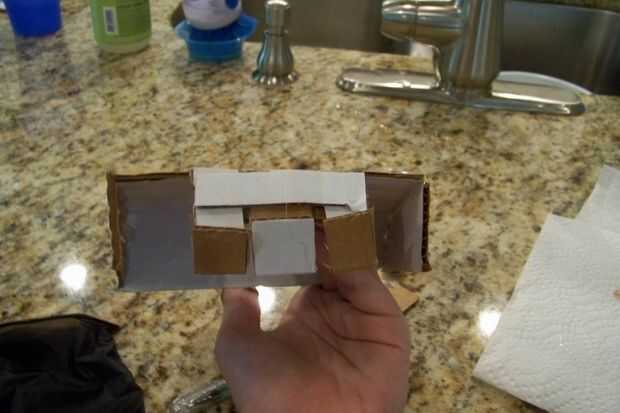 Ahora dependiendo del tamaño de su pronto a ser parrilla la tapa puede ser más pequeño o más grande que el mío pero el tamaño de la mina era cerca de 4 pulgadas por 5 pulgadas. La forma la curva de la tapa fue tomando mis dedos y empujándolos a la pieza de cartón mientras con mi pulgar para apoyar así que no hacer la grieta pequeña como las cosas en él. Luego tomó tres pedazos de cartón 1/2 una pulgada por 2 1/2 y doblar cada uno por la mitad luego había pegado un extremo a la tapa y el otro extremo a la pieza posterior de la parrilla.