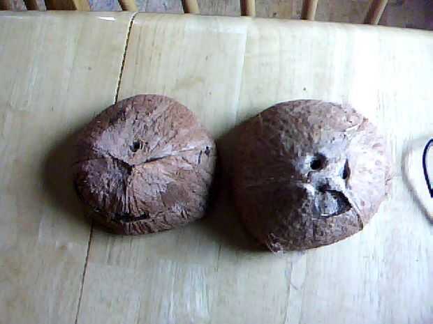 Después de vaciar el coco, perfore dos agujeros, uno en cada mitad, en la parte superior de las mitades de coco. Esto es para la cadena que mantiene juntos.