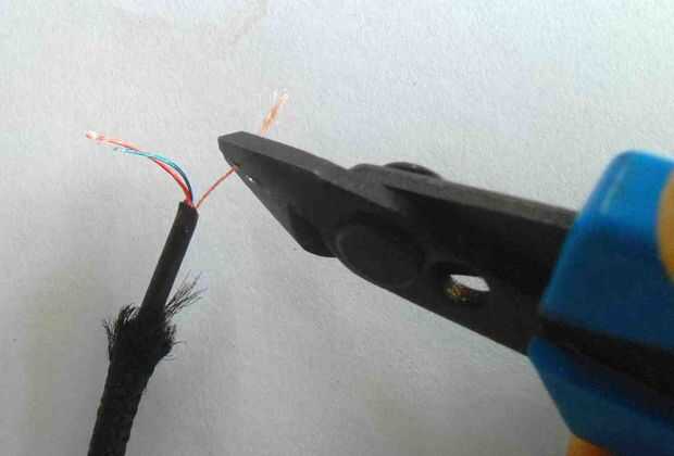- Primer repique de la cubierta externa de la tres hilo de ambos extremos. Verá tres cables de cobre de los extremos (aunque ellos se colorean). El oro es el común el rojo es para el es generalmente para el canal izquierdo y el azul uno es para la derecha del canal aunque los colores no importa mucho pero es un color estándar de los cables de los auriculares. También puede cortar los cables (como estoy haciendo en img 1) como ya he dicho que los colores no importan mucho por lo que puede elegir cualquier color para cualquiera de los canales pero recuerde que los cables que has hecho! (Como se puede ver en imagen 1)
