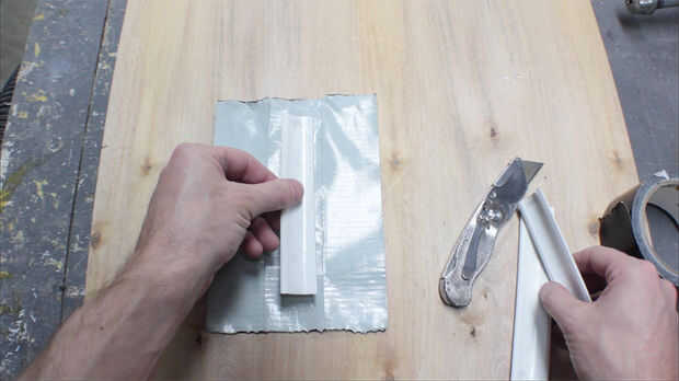 Me puso una cama de cinta luego puso los pedazos del PVC en el lugar, borde externo a borde externo.