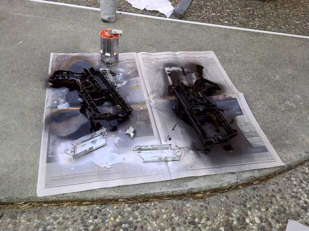 La primera capa de pintura negra en la cáscara. Luego pintar la plata Mech Cocking, lanzan el interruptor del cañón y cañón.