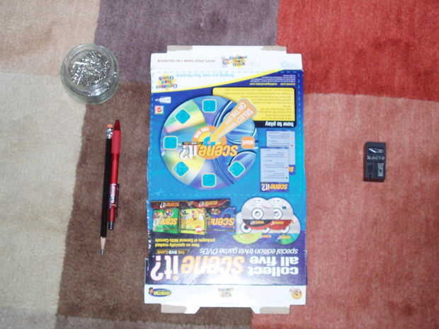Bien ahora lo que necesita para esta compilación simple es un cuchillo x-acto, algunos (el mío es una caja de pan tostado canela crunch) de cartón, un bolígrafo, un lápiz y unas pinzas o cinta si prefieres.