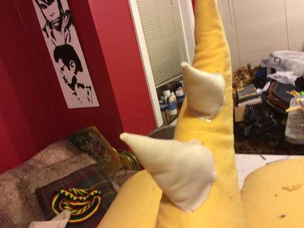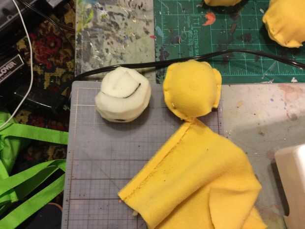 3) cortar los bordes para que sea más esfera en forma de. cubierta en tela amarilla y coser en una bola (Foto 3)