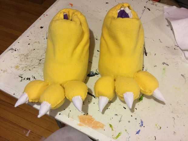 1) coge tus zapatillas difusas y cubrir con la tela amarilla. Cosí en, pero supongo que podría pegarlos sobre si quería ser perezoso. No sé si obtendrá el más limpio de miradas.