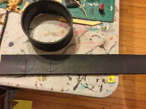 1) cortar una tira larga de espuma eva. debe ser la longitud que se puede envolver alrededor del brazo de su traje.