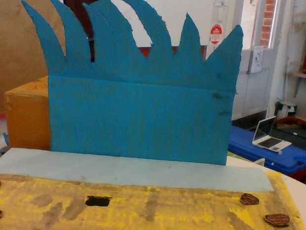 Ahora usted necesita para diseñar la escena, primero Haz dos trozos de papel uno amarillo y uno azul. Cortar en la mitad haciendo un amarillo un poco más grande, ahora peguen encima de la caja de cartón con un palillo de pegamento. Ahora puede Agregar un poco de arena para tener un mejor efecto. Para pegar la arena en utilizamos pegamento PVA.
