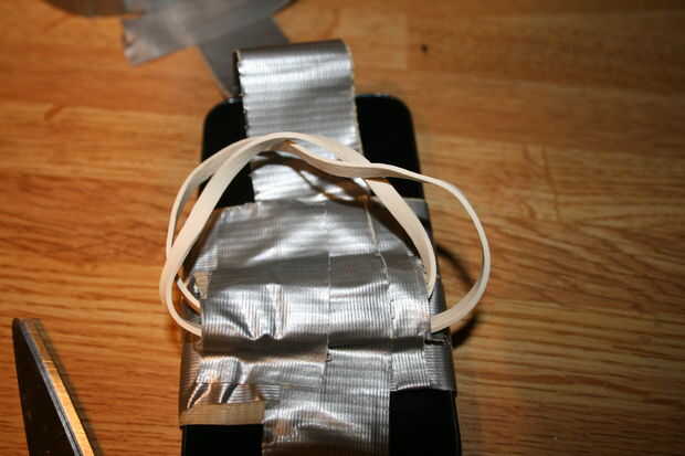 Materiales:TijerasTeléfonoCinta para ductos (cualquier Color)VelcroPaso 1: Envolver el teléfono Decide si quiere que su teléfono entrará en su caso verticalmente.  Si usted desea hacer su caso verticalmente, deje 1/8 del teléfono sobresale de la part