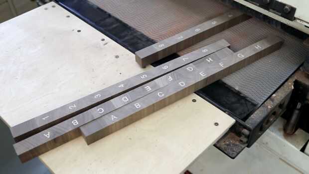 Arena de las tiras con letras y números en la lijadora de tambor.