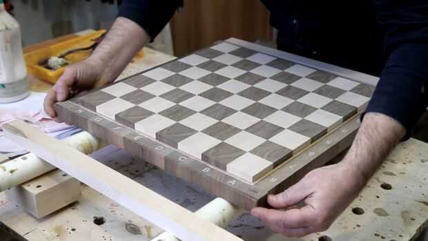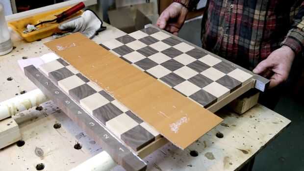 Luego pegué la frontera a la superficie de juego. Hice doble frontera. Primero pegué las tiras 4 mm cerezo, luego tiras de 25 mm nogal. La altura de la superficie de juego fue de 36 mm, la frontera - 24 mm.
