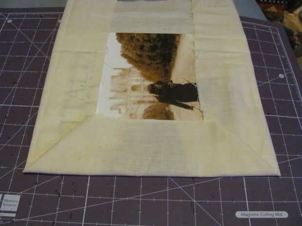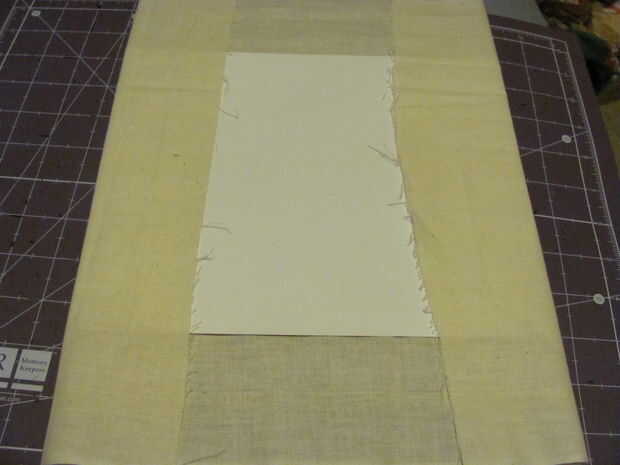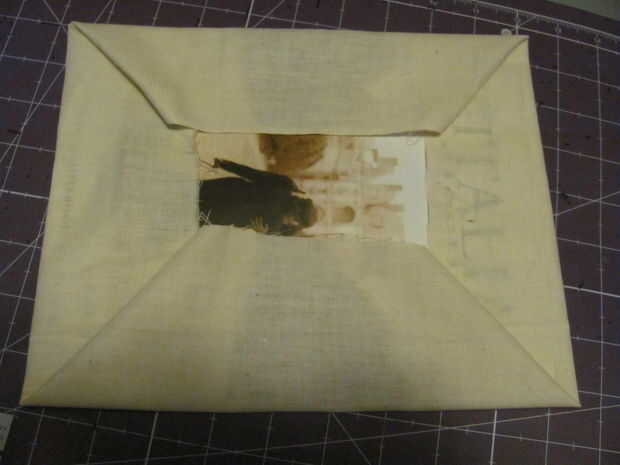 Si tu tela es un poco ver a través (como el mío) Asegúrese de que pones la parte sólida de la inserción en. Es más fácil hacer esto primero que doblarlo y cinta adhesiva, puedes ver a través de él, desplegarlo y re hacerlo se dan cuenta.
