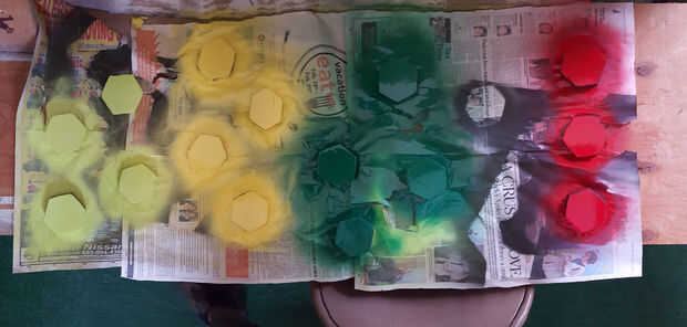 • Luego rocíe las piezas de sus respectivos colores. 3 rojo, 3 gris, 4 verde oscuro, verde claro 4, 4 amarillo, Tan/1 negro.