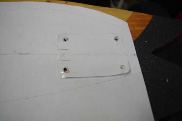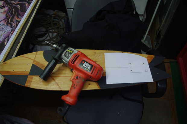 Encontrar la línea central de la tabla. Ya debe saber esto después el énfasis sobre todo siendo simétrica y todos. A continuación, hacer la base de una plantilla pequeña de su camión y doblar por la mitad. Poner el pliegue en la línea de centro y han centrado sus carros! Marque donde taladrar los agujeros y perforar lejos!