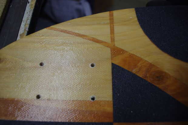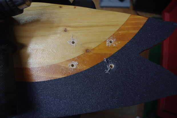Taladro de la parte superior de su Junta en la parte inferior. Instinto le dirá su taladro en la parte inferior ya que es donde van los carros, pero la 'herida de salida' de una broca es siempre peor que la entrada. La fibra de vidrio debe mantener cualquier fragmentación del suceso, pero habrá algún feo pruebas de perforación en el lado por el que sale de la broca. Así perforar desde la parte superior para mantener limpia la parte superior y luego colocar sus camiones en el sucio fondo ;)