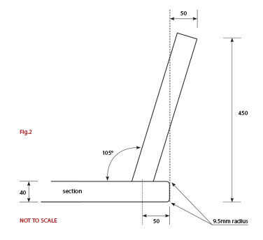 Centrado una pierna 50mm desde el borde inferior en el ápice de la esquina, inclina la pierna hacia fuera para acabados unos 50mm hacia fuera desde el borde del asiento. Estoy feliz con este ángulo para tomar una medición con un calibrador de biselado (Foto 1).