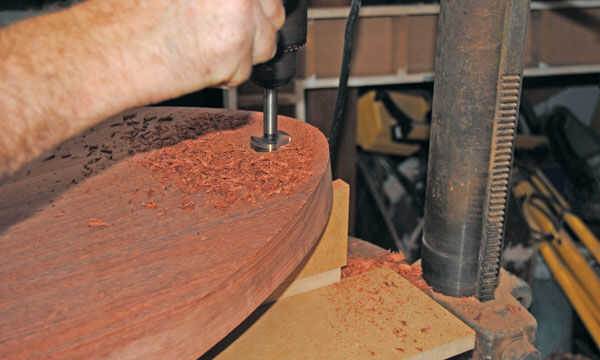 Perforación de los agujeros se completará en mi taladro, por lo que tengo que hacer una plantilla que se llevará a cabo el asiento en el mismo ángulo en relación con el forstner bit como el bisel Ajuste, en este caso 105 ° (Foto 2). Si no tienes una prensa del taladro puede perforar los agujeros a mano alzada utilizando el indicador de bisel como guía, o incluso un construir una plantilla para guiar su taladro de mano. Cualquier técnica puede adopta, asegúrese de marcar el punto de entrada con un escribano y no perfore a través de la sede.