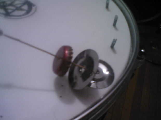 Si no dispone de la maquinaria o fuerza de voluntad para destripar la concha de su trampa para instalar agujeros de puerto pero aún desea experimentar con el efecto de jingle, no te preocupes. Utilizando una cuerda de guitarra (que no desea utilizar la posible de calibre más gruesa, pero es una buena idea para utilizar menos las cadenas A o D para que tengan más textura) puede unos jingles en la cadena del hilo de rosca y entonces la alimentación a través de dos de los agujeros de pequeño puerto en lados opuestos de la cabeza de caja seca de Evans. Esto le ofrece la posibilidad tener jingles derecha sobre la cabeza del tambor (un efecto muy chulo) y dándole también una cadena para jugar con. El sonido de una cuerda de guitarra desplazamiento dentro y fuera de los agujeros del puerto en la cabeza es realmente genial y da un interesante efecto etéreo. Sólo tenga cuidado al hacer esto, porque puede ser fácil arrancarle la cabeza.