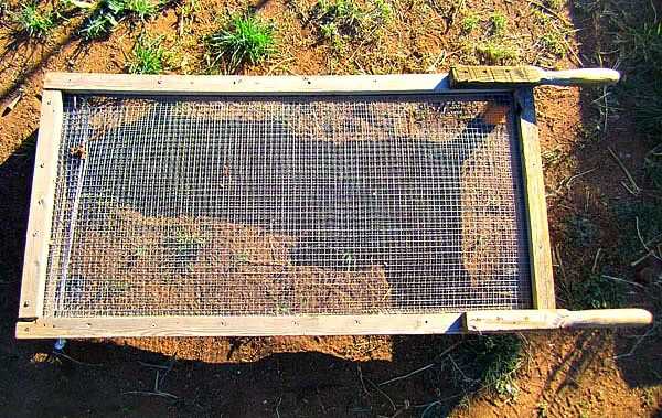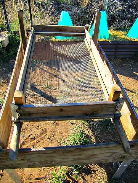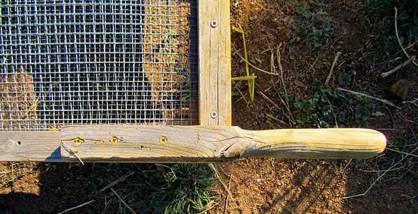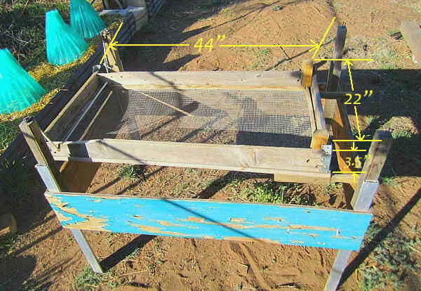 Los lados de la bandeja están hechos de 1x4s atornillada junto con soportes metálicos en ángulo en las esquinas. La pantalla es de 2 capas de tela metálica con orificios de 1/2 y uno con agujeros de 1/4 pulgadas. La tela de 1/2 es proporcionar apoyo para ayudar a sostener el peso de la suciedad.