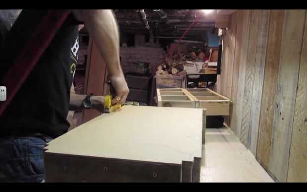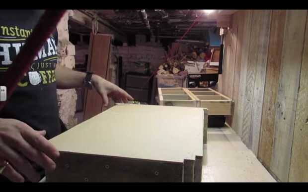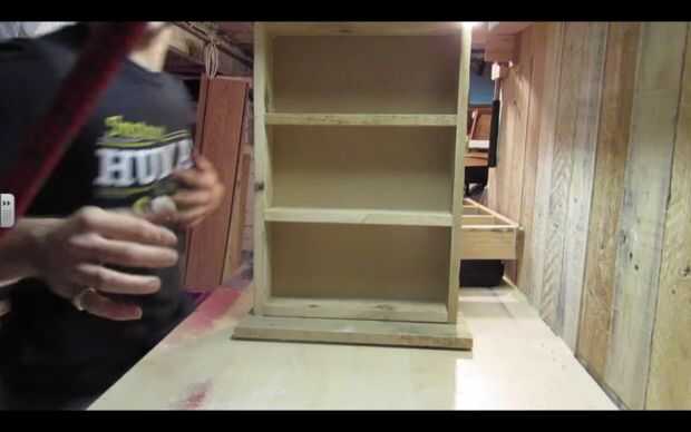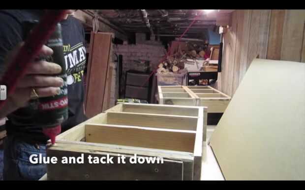 Entonces, pegamento y tack (utilicé una pistola de grapas con tachuelas largo 8mm) las tablas hacia abajo en la parte posterior del gabinete principal.