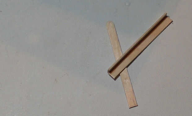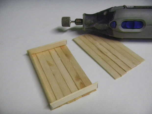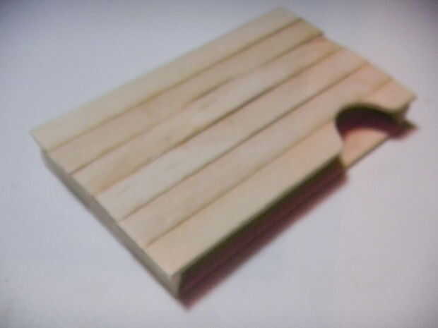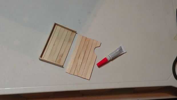 Dos palitos más marcados y cortadas para ser ligeramente más ancha que el ancho total de la caja, de modo que pueden ser pegados juntos en ángulo recto para formar la cubierta que se pliega sobre el caso. Pequeñas piezas cuadradas fueron también cortar pegados a los lados de esta cubierta y luego en forma de triángulos utilizadas una herramienta rotativa Dremel.