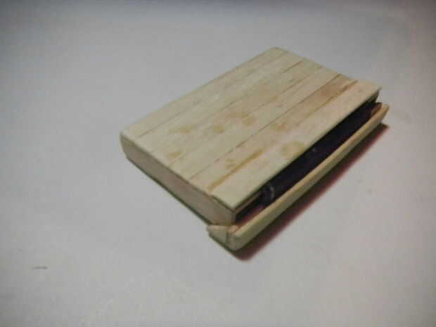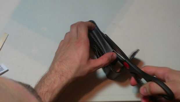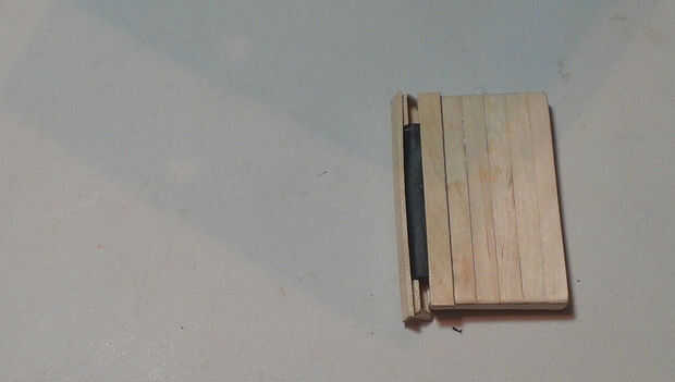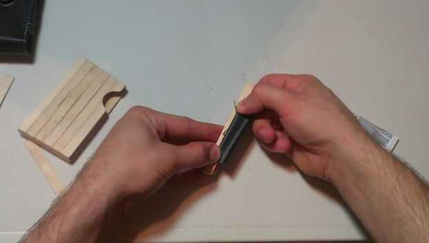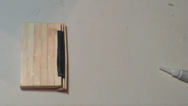 La pieza debe ser cortado y un lado pegado a la parte seis-stick y el otro en la parte posterior de la cubierta. Dos palitos deben cortar a la longitud y pegados sobre el pedazo de cuero, tanto en la parte inferior y en la cubierta. Lijar y dar forma deben hacerse con este paso también.