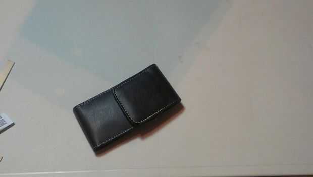 La bisagra de este caso fue hecha de una pieza de cuero del faux del corte de un soporte para teléfono que compró en la tienda de dólar.