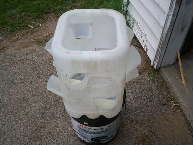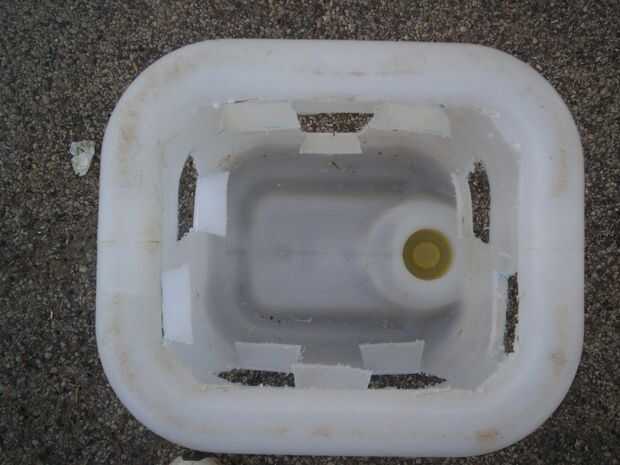 Conjunto la mitad botellas/copas en los agujeros de la maceta. La parte superior de la "olla" debe ser un poco sobre la parte superior del agujero, así que no resbale dentro. Corte de cualquier exceso botella/taza. (Fotos #4)