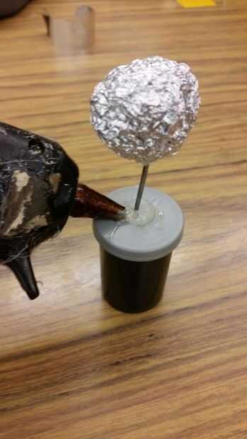 La bola de papel de aluminio y pegarlo en la parte superior de la percha. Pegamento caliente la percha a la tapa por lo que permanece en su lugar.
