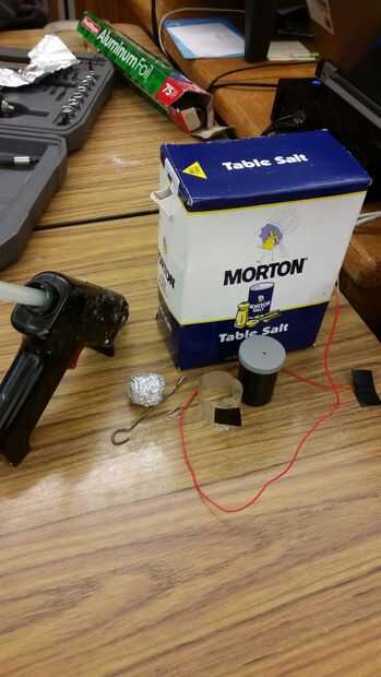 la clásica jarra de Leyden (una forma temprana de condensador de condensador eléctrico) es un vaso o frasco de plástico forrado con papel de aluminio en el exterior y el interior, a veces con agua salada o agua acidificada como el electrodo. En este