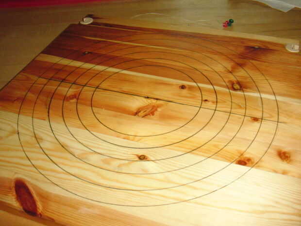 Luego marque en incluso incrementos a lo largo de esta línea de centro, estos conforman los anillos de la taza. La distancia entre las líneas depende de usted, si usted hace la distancia de la misma como el grosor de la tabla entonces no habrá ningún "paso" en su tazón de fuente. Elegí tener pequeñas 1/8" pasos en mi tazón porque creo que parece bastante interesante. Esto hizo que mis líneas un poco menos de 1" aparte. Dibujé a seis líneas, el mayor ser unos 14" desde el centro y el más pequeño unos 8".