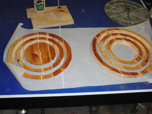 Acabo de poner un gran pegote de pegamento en un tablón de madera y cruce los extremos del anillo. Colocar un papel de cera para que los anillos no se peguen a la mesa.