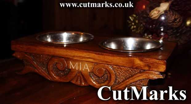 Este tazón de fuente del perro fue creado a partir de vieja madera de la plataforma y talladas a mano con hojas decorativas y mi nombre de perros.