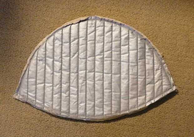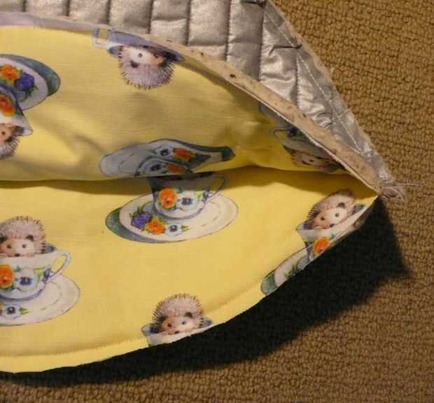 • Luego poner un sistema de tela acolchado Plata lado hacia abajo y el otro conjunto de tela había acolchado plata lateral, por lo que los derechos de las piezas de erizo son uno frente al otro en el centro. El perno a través de todas las capas. Coser solamente alrededor del borde superior curvado más (no a través de la parte inferior de menos curvas) a través de todas las capas con sobre un margen de 3/8. Usé una máquina remalladora para esta costura (la clase que crea una puntada nublada) pero no tengo una foto.