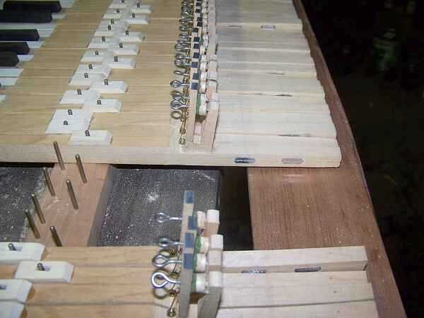 En pianos de cola calificadosobreros Coloque claves pesos a mano con la acción todo montada por lo que toma un peso mínimo especificado para hacer cada jugada clave. Esto habría sido imposible de hacer con las llaves de mi de todos modos, pero recientemente este tema ha sido explorado un poco más, que se puede leer aquí y aquí. Las llaves de mi estaban todos pesado frontal pero en este tipo de acción que necesitan para ser pesados nuevamente por 15 gramos y volver a descansar por sí mismos para que se repita y tiene la cantidad correcta de resistencia, y uno de los pocos lugares para poner pesos habría sido inaccesible ya que está directamente por debajo de uno de los carriles de acción.