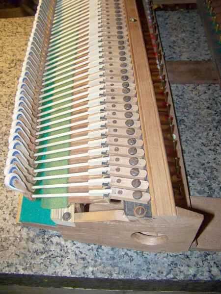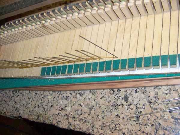 Entonces me áspera había regulada la acción. Profesor de piano tuning Oliver Faust dio instrucciones para la regulación de la "antigua plaza inglés" acción e ilustrado en Boston en la década de 1830, pero no terminan de seguirlas muy de cerca. Conjunto con cerca de 1 milímetro perdida movimiento entre las tolvas y me underhammers bastante que las teclas podrían volver descansar incluso moviéndose lentamente, moviendo el ferrocarril underhammer de resto, que es el estrecho unmarked atornillado al riel underhammer en foto de Fausto. Ajusté la altura de los martillos sobre el riel underhammer por un poco más que el espesor de la tela de la tira que se pegan entre ellos por presentar o pegar las cuñas en la parte inferior de las cuñas dependiendo de si eran demasiado alta o demasiado baja. Ajusté las tolvas para que movido de un tirón hacia fuera de las underhammers cuando los martillos eran un poco cortos de la altura de las cuerdas por encima de la cama clave. Cuando los martillos a esta altura mis llaves descienden un poco más de 8mm.