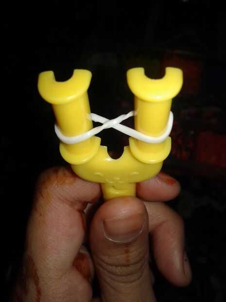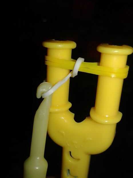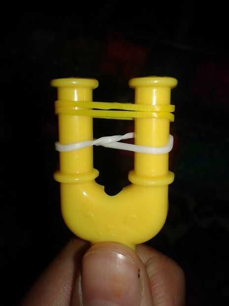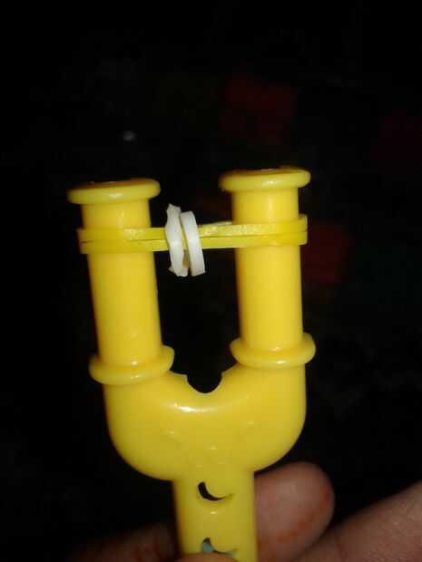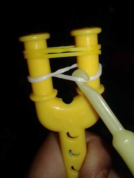En primer lugar, agregue una banda de caucho con un toque como fig 8 luego agregue dos gomas más con giro. Ahora toma la goma hacia abajo (se muestra aquí blanco) y ponerla en las dos bandas de caucho (que se muestra aquí amarillo). Lo mismo al otro lado.