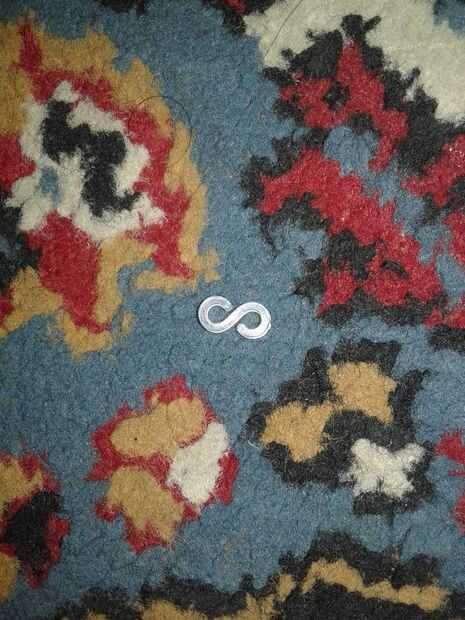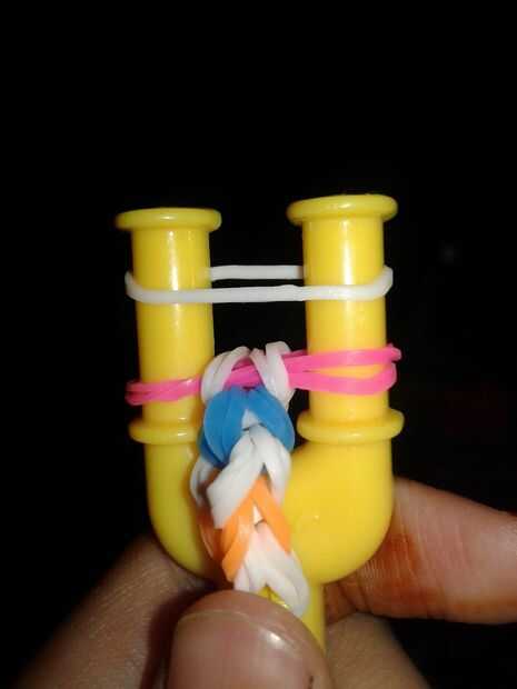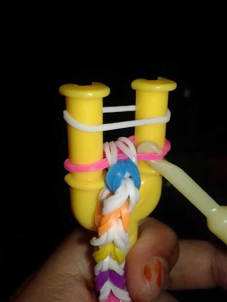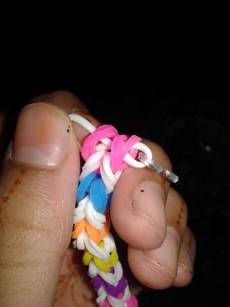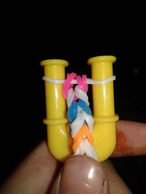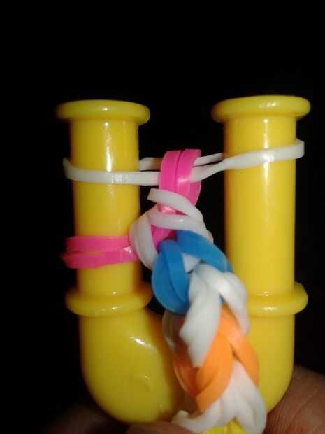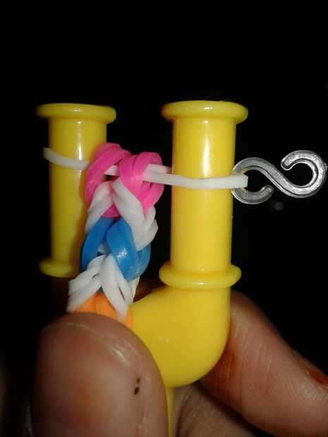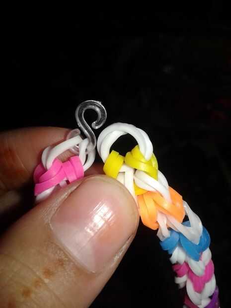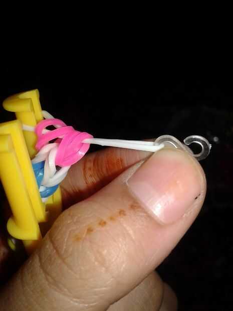 Al llegar al final añadir una banda de goma (se muestra blanco aquí) y tomar las dos gomas abajo (pin se muestra aquí) y pones uno arriba. Tome un clip S o C y ambos lados del gancho en el clip.