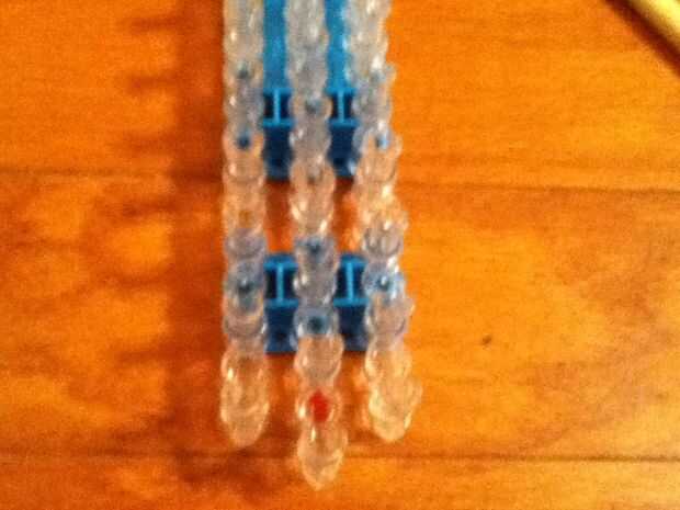 aquí hay un tutorial de una pulsera única triple.Paso 1: materiales Necesita 3 bandas de colores diferentes, su telar y su gancho.Paso 2: Poner las bandas en This step is easy! Simplemente poner las bandas en una fila y al revés por triángulos.Paso 3