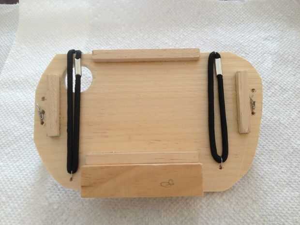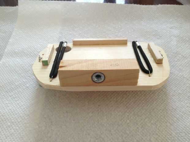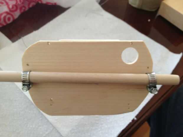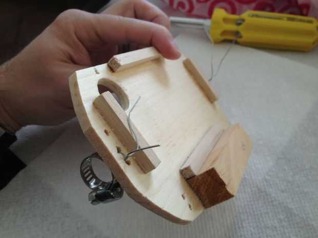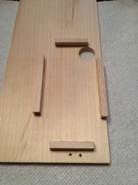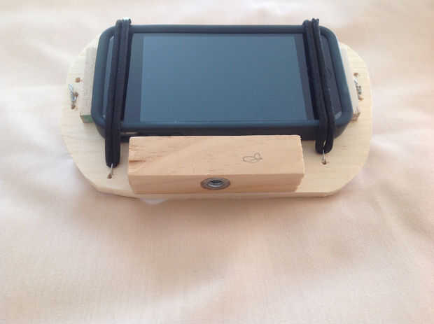 Las piezas laterales son cuadrados ¼" espiga. No funcionan la longitud entera del teléfono para que las bandas de elástico podría fijarse en cada extremo del teléfono sin la interferencia de la moldura. Esto también hace más fácil para los dedos agarrar el teléfono cuando se mueve dentro y fuera del marco adaptador. Los agujeros pequeños fueron perforados para que podría utilizar alambre para fijar las abrazaderas de manguera a la parte inferior del adaptador y para anclar los elasticos (ver fotos).