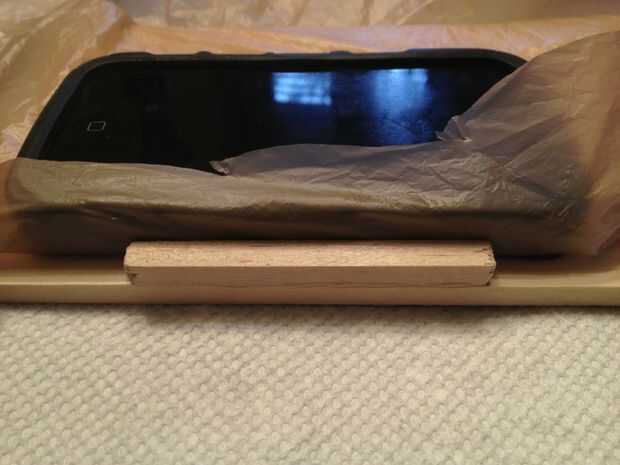 Para colocar la moldura de madera a cada lado, usé una bolsa de plástico para envolver mi teléfono para no tener que preocuparse por conseguir pegamento en mi teléfono. El pegamento no se pegue a la bolsa de mandado, no incluso epoxi. Entonces sostuve cada pieza de adorno de madera apretado contra mi teléfono mientras el epoxi endurecido. Utiliza epoxi de dos partes de 5 minutos y me pega cada pieza en su lugar uno a la vez. Si tuviera que hacerlo de yo probablemente podría han utilizado mayor ¾" pulgadas cuadrados ajuste con el perno hexagonal para reemplazar la cuarta pieza de moldura más pequeñas directamente encima de él.