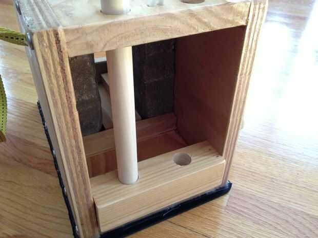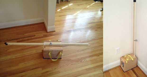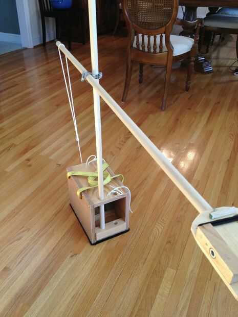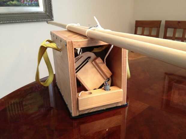 He hecho algunas mejoras al diseño original. Esta mejora cotiza la simplicidad de la anterior base para una solución más permanente e integral. En lugar de tratar de localizar objetos pesados para anclar la base cada vez que quiero configurar el boom, vuelva a he diseñado la base de peso construido en él. La nueva base utiliza un diseño de caja con dos adoquines de hormigón dentro de lastre y agujeros en la parte delantera de los tacos en. He actualizado los tacos a 3/4" pulgadas utilizar un mouse pad con una superficie suave y antideslizante en la parte inferior. También hay suficiente espacio dentro del soporte de la base de la placa de adaptador de la cámara y las cuerdas. Usé algunas correas de nylon amarillo viejo a los mangos y había conectado haga un nudo en el interior de la caja para que no se tiran a través de los orificios laterales. Dos juegos de agujeros más pequeños en la parte superior en la parte delantera y trasera de la caja permiten un cordón atar los tacos para llevar, y todo el sistema se puede almacenar fuera del camino por las clavijas de pie vertical en la base cuando no esté en uso. Ajustaron un antiguo hexagonal en una tuerca de alambre grande para que sea más fácil ajustar las abrazaderas de manguera, así que no más buscando un destornillador. Usé pegamento de Weldbond para sujetar la alfombrilla del ratón a la parte inferior del soporte.