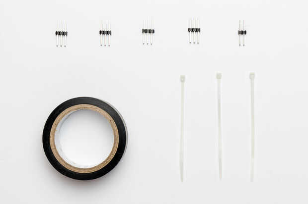 Lista de opcionales cubre cosas que es bueno tener, pero son no es necesario para ejecutar el trabajo. 'Solo encabezado de fila conector 2,54 mm Pitch, 17mm longitud patillas' puede ser utilizado en su lugar 'Dupont Jumper cable conector macho de 10cm de longitud'. Lazos de cable y cinta aislantes son útiles para la fijación de cables.